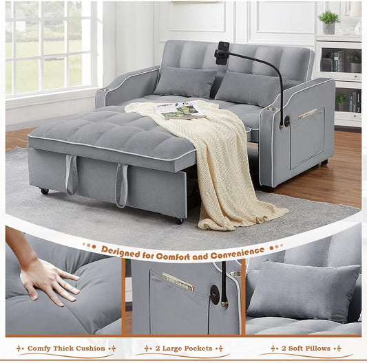 Convertible Sofa Bed with Pull Out Bed - 55" Tufted Velvet Loveseat Sleeper Sofa Adjustable Back with USB Port Ashtray Swivel Phone Stand, Pockets-Perfect for Small Spaces, Living Room Furniture