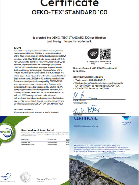 CertiPUR-US® - Health, OEKO-TEX Standard 100, and Sanitized - Dust Mite Prevention. They are 100% free from ethylene and harmful substances,